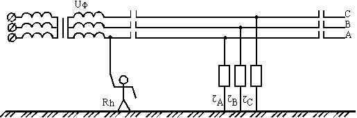 rА = 10 кОм, сопротивление фазы «В» rВ = 100 кОм; сопротивление фазы «С» rс = 1 МОм; сопротивление тела человека Rh = 1 кОм.