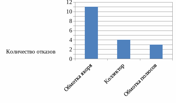 Анализируя таблицу 1.2, можно сделать вывод что, обмотка якоря является наименее устойчивым, к высоким температурам, узлом. За период равный трем годам, по причине перегрева обмотки якоря, было зафиксировано 11 случаев выхода из строя тяговых электрических двигателей. За тот же период, по причине перегрева коллекторного узла, зафиксировано всего 4 подобных случая. Перегрев дополнительно полюса, стал причиной 3-х выходов из строя двигателей. По результатам анализа так же строится гистограмма (рисунок 1.2), которая наглядно показывает устойчивость узлов к повышенным температурам.