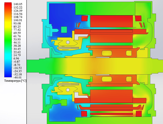 По результатам расчета видно, что максимальное значение температуры воздуха снизилось на 10 °C, максимальный нагрев обмотки статора снизился меньше чем на 4 °C.