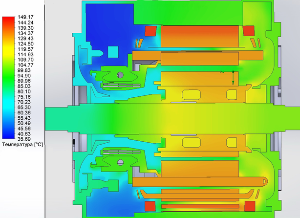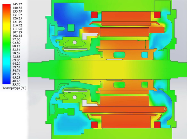 По результатам расчета видно, что максимальное значение температуры воздуха снизилось на 10 °C, максимальный нагрев обмотки статора снизился меньше чем на 4 °C.