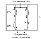 На рисунке 1 приведена схема одной фазы такого реактора с бронестержневым магнитопроводом и двумя полустержнями, на которых расположены секции сетевой обмотки и обмотки управления, к которой в свою очередь подключен источник постоянного или выпрямленного напряжения для подмагничивания. Постоянный поток подмагничивания, создаваемый током ОУ, замыкается между центральными полустержнями, а переменный поток – через верхние и боковые ярма магнитопровода, складываясь в полустержнях с постоянным.