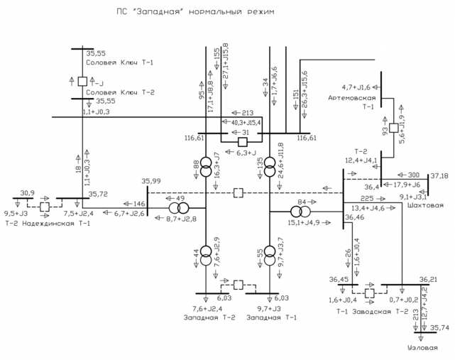 Рисунок 1.1 – Схема распределения мощностей в электрической сети, прилегающей к ПС 110/35/6 кВ «Западная»