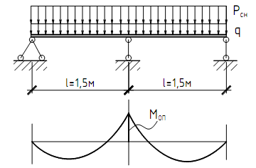 Настил рассчитывается по схеме двухпролётной неразрезной балки. Изгибающий момент на промежуточной опоре (проверка на прочность и прогиб) при первом сочетании нагрузок (постоянная и временная от снега):
