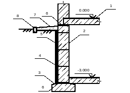 4 –утеплитель «Пеноплекс- Ф»; 5 - оклеечная гидроизоляция; 6 – горизонтальная гидроизоляция; 7 – отмостка; 8 – бортовой камень