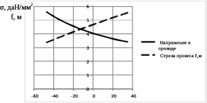 | Температура, | Напряжение в проводе, | Стрела провеса, f, м |