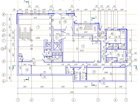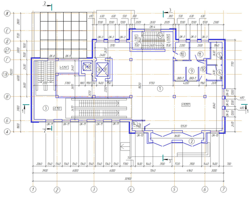 Проектируемое пассажирское здание - трехэтажное, с высотой 1 и 2 этажей -3,6 м и третьего этажа -5,1м, с размерами в плане в осях 30,9 м х19,2м. За относительную отметку 1,250 принят уровень пола первого этажа, что соответствует абсолютной отметке 18,350 м.