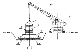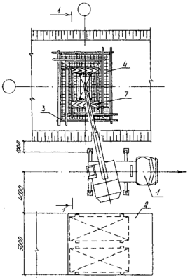 1 - кран автомобильный Kato NK-550; 2 - площадка складирования; 3 - опалубка фундамента; 4 - уложенные арматурные сетки; 5 - устанавливаемый арматурный каркас; 6 - строп; 7 - инвентарный щит (изготавливается по месту); 8 - фиксатор защитного слоя бетона