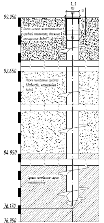 Рисунок 1.14 Общий вид винтовой сваи с геологическим разрезом