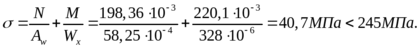 Шов Ш1 проверяем на комбинацию усилий M и N соответствующие M=220,1кНм, N=198,36кН. Так как концы швов выводятся за пределы стыка, то принимаем Aw=A; Ww=Wx.