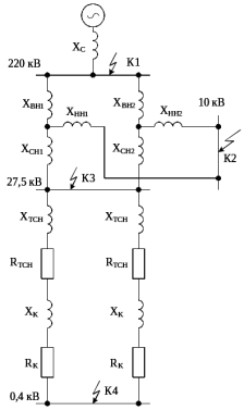 Расчетная схема для расчета тока короткого замыкания до точки К4 приведена на рисунке 1.4.