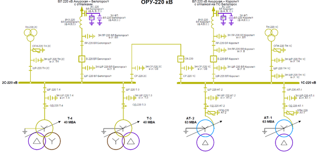 - с целью предотвращения отключения от сети 220 кВ обоих трехобмоточных трансформаторов на время отключения секции (планового или аварийного) необходимо подключение трансформаторов на разные секции СШ 220 кВ.