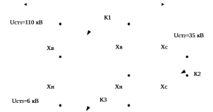 В проекте необходимо произвести расчет токов короткого замыкания для всех РУ. Расчет будет производится в именованных единицах по методике [4]. Для чего на основании схемы внешнего электроснабжения, исходных данных и принятой схемы главных электрических соединений подстанции составляется структурная схема (рисунок 4.1) и расчётная схема замещения (рисунок 4.2).