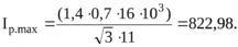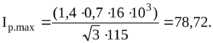 где Кп=1,4– коэффициент, учитывающий перегрузки трансформатора, фидера; Крн=0,7 – коэффициент распределения нагрузки по сборным шинам; Sтр – номинальная мощность трансформатора; Uн – номинальное напряжение ступени, кВ.