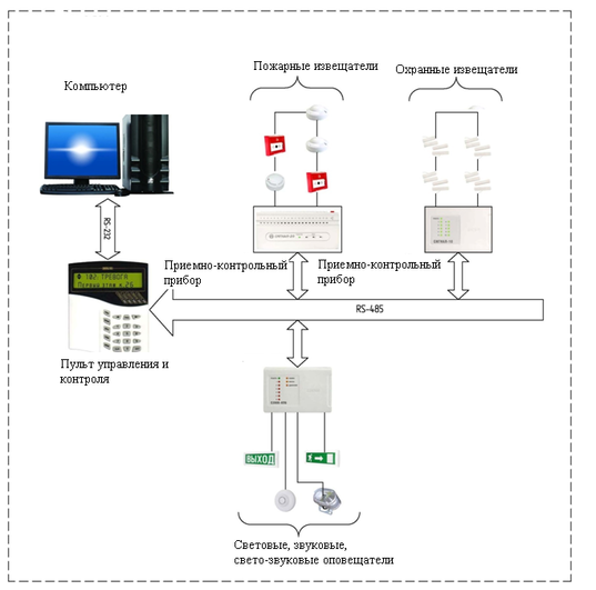 Для управления и отображения работы системы применяется компьютер с установленным программным обеспечением «Орион», имеющим разъем интерфейса RS-232, который находится в помещении диспетчера подстанции в здании ОПУ. Приборы интегрированной системы безопасности объединены магистральной шиной интерфейса «RS-485».