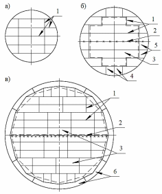 1 – заводские швы; 2 – монтажные швы; 3 – листы центральной части днища; 4 – прямоугольные окрайки поперечные; 5 – прямоугольные окрайки продольные; 6 – сегментные окрайки