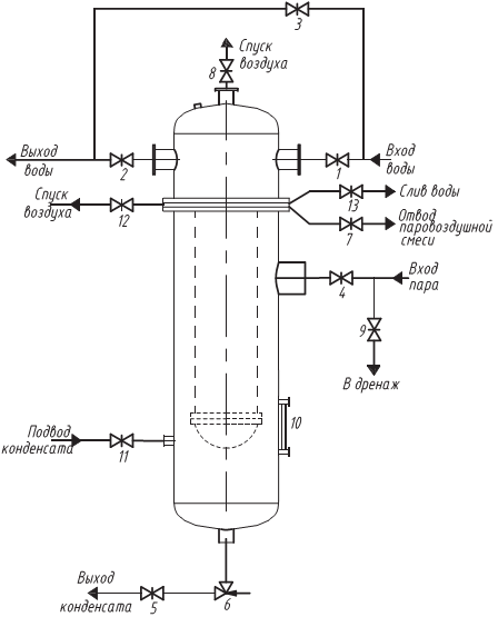 Пар, поступающий через входной патрубок (входной паровой патрубок и патрубки для входа и выхода сетевой воды изображены с транспортными заглушками, которые отрезаются при монтаже на ТЭЦ), движется, конденсируясь зигзагами, по направлению к месту отсоса паровоздушной смеси. Образующийся конденсат стекает в конденсатосборник, откуда в зависимости от схемы включения ПСВ он направляется в ПСВ с меньшим давлением или в систему регенерации турбины. Для приема неконденсирующихся газов из подогревателя с большим давлением или их сброса в СП с меньшим давлением корпус рассматриваемого подогревателя снабжают специальным штуцером. Для контроля за работой ПСВ его снабжают измерениями давления и температуры греющего пара, температур на входе и выходе сетевой воды, конденсата греющего пара.