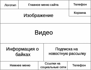 Заказчиком было определено, что сайт должен содержать раздел, посвященный информации о предприятии, раздел, включающий информацию о велосипедах, а также раздел с информацией о том, как стать дилером. Внизу должны быть ссылки на контакты предприятия и на различные социальные сети, в которых есть информация о предприятии. Помимо всего этого, на сайте должна быть возможность оставить заявку на покупку байка путем заполнения формы, в которой указываются контакты клиента, по которым менеджер может связаться с ним и уточнить адрес доставки. Также необходимо дать клиенту возможность задать интересующий его вопрос и подписаться на новости.