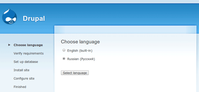 Открыть в браузере сайт http://tokyobike.ru/install.php для запуска установки Drupal, выбрать нужный язык, нажать «Далее».
