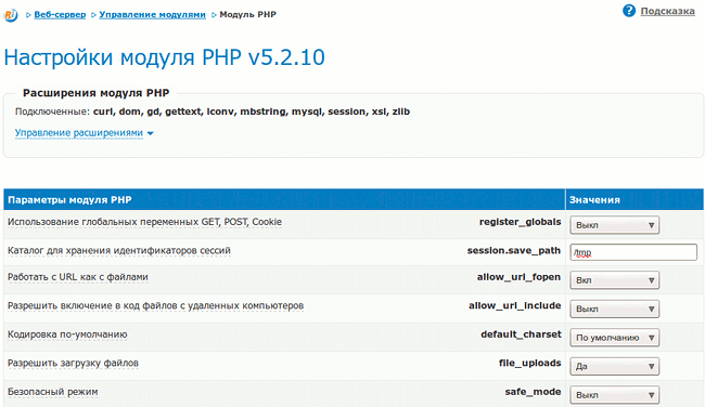 В таблице «Параметры модуля PHP» устанавливаются следующие значения: