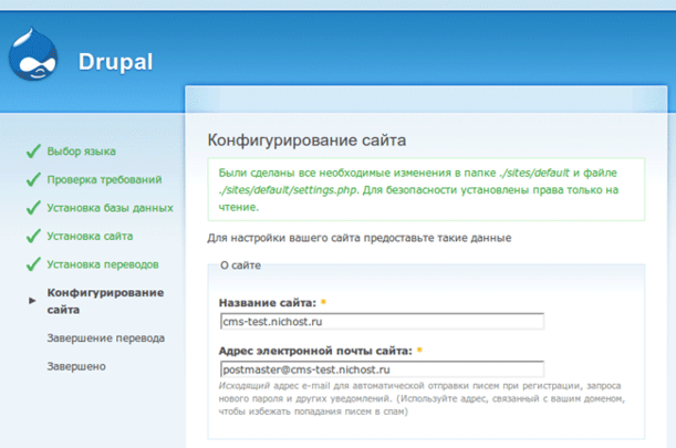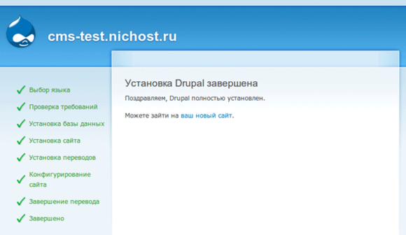 В случае успешной установки Drupal появится изображение, как на следующем скриншоте.