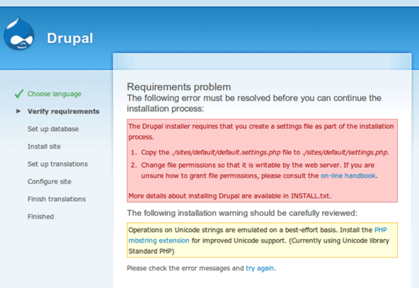 Копируем файл /docs/sites/default/default.settings.php в файл с именем /docs/sites/default/settings.php. Исходный файл default.settings.php должен также остаться в папке.