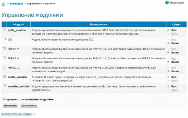Теперь нужно настроить web-сервер. После перехода в раздел web-сервер/управление модулями и включаем и настраиваем модуль PHP 5.2.10.