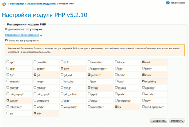 В списке модулей необходимо осуществить переход по ссылке PHP 5.2.10. После перехода в блоке «Расширения модуля PHP» разворачиваем список расширений кликом по ссылке «Управление расширениями» и выбираем «Показать все расширения». В появившемся блоке отметить следующее: curl; gd; gettext; iconv; mbstring; mysql; session; xsl; zlib. И сохранить.
