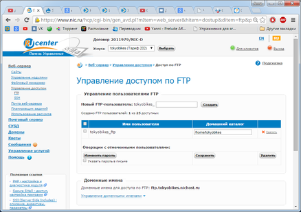 Теперь получим доступ по FTP. Для этого нужно перейти в раздел Веб-сервер/Управление доступом/FTP/Пользователи FTP. Отметим имя нужного пользователя галочкой. Также рекомендуется поставить галочку «Указать пароль в письме». Нажимаем «Изменить пароль». Пароль будет отображен на экране.