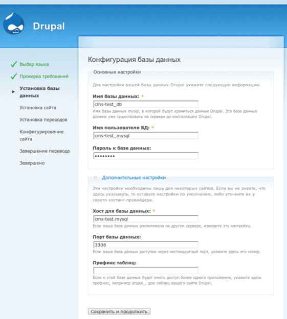 Далее нажать «Сохранить и продолжить». Дождаться окончания установки, после чего заполнить необходимые поля: