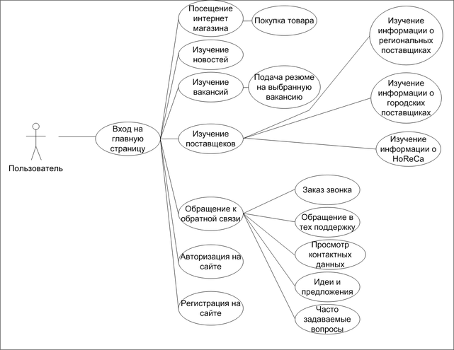 Модель использования информации и функционала сайта можно представить в виде диаграммы вариантов использования UML (Unified Modeling Language), унифицированного языка моделирования систем [7].