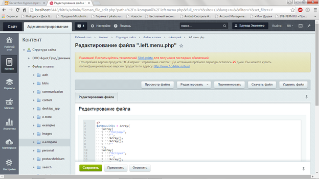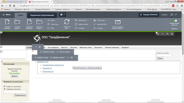 Используемый продукт содержит две консоли для настройки и разработки сайта. Первая позволяет вносить изменения при визуальном интерфейсе сайта (рисунок 7).