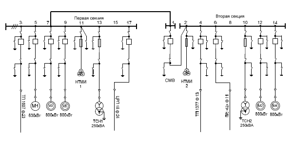е) схема модернизируемого РУ-6кВ принята четырех секционной и определяется внедрением преобразователей частоты для асинхронных двигателей.
