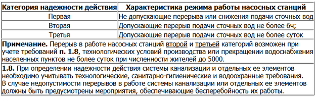 Оборудование КНС подбирается исходя из ряда требований. Первое и самое важное требование - это категория надежности насосной станции, то есть характеристика допустимых перерывов в работе КНС. Ниже приведена таблица категорий согласно СНиП 2.04.03-85[5].
