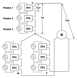 В конструкции, показанной на рисунке 3.3 преобразователя частоты инверторы представляет собой многоуровневое соединение преобразовательных ячеек.