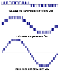 Принцип управления, показанный на рисунке 3.4 основан на широтно - импульсной модуляции. Последовательное подключение ячеек преобразователя формирует синусоидальную форму напряжения.