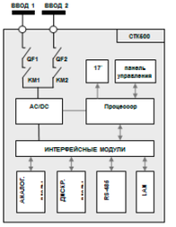 Технологический контроллер СТК500 производства ООО «Сибирь-мехатроника». Эта компания занималась модернизацией хабаровского оборудования. Контроллер СТК500 предназначен для построения комплексных систем автоматического управления технологическим процессом объектов, имеющих сложную или распределенную структуру технологической цепи. Его схематичное изображение можно увидеть на рисунке 3.5.