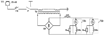 ТП – токоприемник; ГВ – главный выключатель; Р – разъединитель; Тр – тяговый трансформатор; ВУ – выпрямительная установка; СР – сглаживающий ректор; Я – обмотка якоря; ОВ – обмотка возбуждения; ТД – тяговый двигатель; Rш – активное шунтирующее сопротивление.