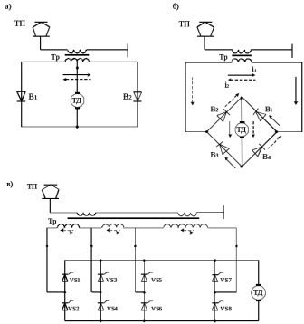 Выпрямители электровозов могут быть соединены с обмоткой трансформатора различными схемами: двухполупериодная схема с нулевой точкой, мостовая схема и четырехзонная мостовая схема (рисунок 1.4).