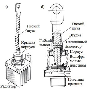 На электроподвижном составе используют вентили (рисунок 1.2, а), рассчитанные на большую мощность. Основу вентиля составляет выпрямительный элемент с кремниевой пластиной (рисунок 1.2, б) толщиной от 0,4 до 0,5 мм. Чтобы защитить хрупкую пластину от механических воздействий, к ней припаивают с обеих сторон две вольфрамовые пластины, имеющие примерно такой же коэффициент линейного расширения, что и кремниевая. Герметический корпус предотвращает проникновение к выпрямительному элементу влаги, пыли и грязи[1].