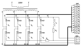 Выпрямительно-инверторный преобразователь собран из тиристоров типа КУ201Е. Каждое из восьми плеч заменено одним тиристором (VS1-VS8). Для моделирования неисправностей – обрывы плеч - последовательно с каждым тиристором включен ключ (S1-S8). Управление тиристорами осуществляется в соответствии с алгоритмом работы электровоза от системы управления.
