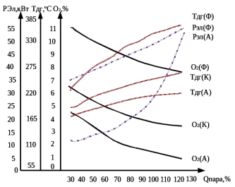 Например, расхода пара Qпара: содержания кислорода в дымовых газах (О2); электрической мощности (Рэл), потребляемой из сети вентилятором и дымососом; температуры дымовых газов (Тдг) для различных систем автоматики котла и вариантов их настройки. Так новая оптимизированная автоматика котла с автоматической коррекцией коэффициента α на графиках обозначена как – (А). Существующая автоматика котла с дополнительно установленными приборами контроля качества сжигания топлива и ручной регулировкой α по режимной карте – (К). Существующая автоматика котла без переделок схемы, которая работает фактически не по режимной карте – (Ф), в результате длительной эксплуатации после наладки.
