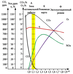 Следующим логичным этапом энергоэкологической оптимизации сжигания топлива является внедрение технологических решений, направленных на организацию горения с низким или предельно низким коэффициентом избытка воздуха. Положительного эффекта можно достичь даже на существующем газогорелочном оборудовании, только при использовании систем непрерывного автоматического контроля и регулирования соотношения «топливо – воздух». Это – наиболее малозатратный и эффективный способ экономии топлива с одновременным уменьшением образования вредных веществ в топке. При этом необходимо поддерживать подачу воздуха так, чтобы значение коэффициента α находилось в довольно узкой области (зона А на рисунке 1.8), нижнюю границу которой определяет появление следов оксида углерода (на уровне 100 – 300 ppm), а верхнюю – рост потерь теплоты с уходящими газами и повышение интенсивности образования оксидов азота, сопутствующее росту концентрации свободного кислорода. К проблемам применения данного способа стоит отнести сложность получения высококачественной топливо – воздушной смеси для исключения химического недожога. Особенно это важно при небольших нагрузках котла, когда в целях регулирования расхода давление воздуха снижают до критического значения, при котором горелочное устройство не может обеспечить аэродинамические условия интенсивного смесеобразования в корне факела. Это может вызывать увеличение потерь теплоты от химического недожога топлива и снижение экологичности работы котлоагрегата вследствие выбросов высокотоксичного оксида углерода (СО). Для исключения подобных ситуаций при наладке идут на увеличение расхода воздуха, что в свою очередь ведет к возрастанию потерь теплоты с уходящими газами. Основной причиной, ограничивающей сжигание топлива с предельно низким коэффициентом избытка воздуха, является сложность поддержания оптимального соотношения «топливовоздух» на границе возникновения химического недожога. Обеспечить это можно только на базе микропроцессорных систем регулирования, для которых в свою очередь необходима оперативная информация о составе уходящих газов [8].