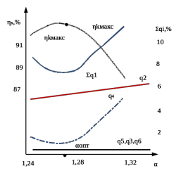Одним из наиболее представительных косвенных способов оценки экономичности процесса горения служит анализ состава топочных газов, покидающих топку. На основе зависимости КПД и суммарных потерь от избытка воздуха, определяемой индивидуально для каждого агрегата, целесообразно поддерживать коэффициент избытка воздуха