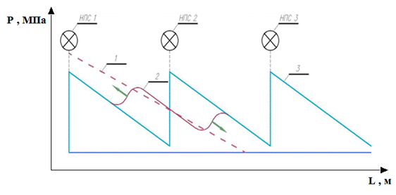 1 – давление после остановки НПС-2; 2 – изменение давления в момент остановки НПС-2; 3 – давление до остановки НПС-2.