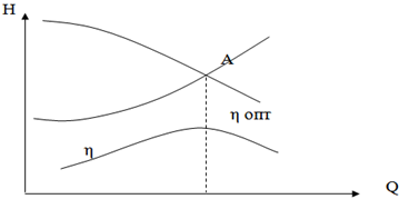Режим работы насоса определяется положением рабочей точки на его характеристике. Рабочая точка насоса находится на пересечении напорной характеристики насоса и гидравлической характеристики сети. Рабочая точка насоса должна совпадать с его оптимальным КПД. На практике, в силу различных причин насосное оборудование работает далеко не в оптимальном режиме, что приводит к необоснованному увеличению потребления электрической энергии. На рисунке 2.4 показана рабочая точка А при оптимальном КПД.