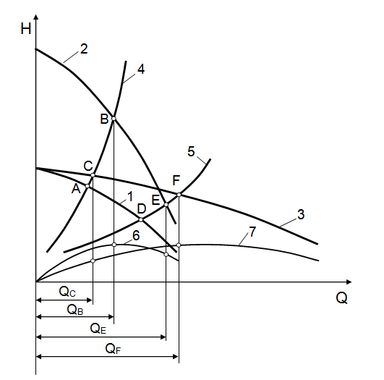 1 – характеристика насоса; 2 – напорная характеристика НПС при последовательном соединении насосов; 3 – напорная характеристика НПС при параллельном соединении насосов; 4,5 – характеристика трубопровода; 6 – (H–Q) характеристика насоса при последовательном соединении; 7 – (H–Q) характеристика насоса при параллельном соединении.