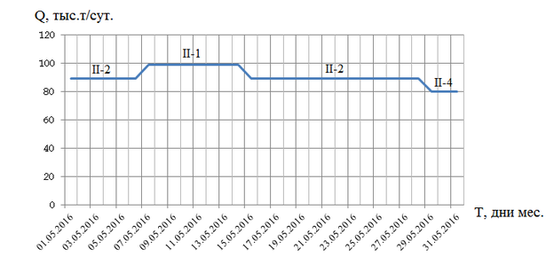 Режимы работы системы "насосная станция - нефтепровод" непрерывно меняются во времени. На рисунке 2.3 представлен график в течение одного месяца (за май месяц 2016 года) на НПС тридцать шесть. По оси абсцисс отложена производительность, по оси ординат – время, в течение которого нефтепроводы работали в месяце при данной производительности в разных режимах работы(II- 1, II- 2, II- 4).