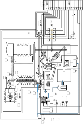 При подаче питания на вентиль привода вакуумной камеры 1 UA2 через контакты 4–3 блокировочного переключателя SQ2 вентиль пропускает воздух в цилиндр привода вакуумной камеры. Поршень перемещается вниз и тянет за собой изоляционную тягу 5, которая, преодолевая сопротивления пружины отключения 17, поворачивает рычаг 18, при этом замыкаются контакты вакуумной камеры 4. При дальнейшем перемещении поршня создается дополнительное нажатие контактов пружиной поджатия 19.
