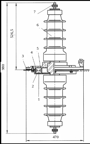 Нелинейный резистор типа ВНКС-25 (рисунок 1.2) состоит из полого фарфорового изолятора 1, внутри которого расположены керамические шайбы 2, прижимаемые пружиной 3. Фланцы 4 закрывают изолятор с торцов и одновременно используются для крепления резистора к главному выключателю. Резистор ВНКС-25М рассчитан на номинальное напряжение 25 кВ.