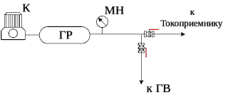 Пневматическая схема подачи сжатого воздуха к стенду «Главный выключатель» представлена на рисунке 2.3. Электродвигатель приводит в движение за счет ременной передачи двухцилиндровый компрессор К типа КБ-1В. Компрессор качает сжатый воздух в главный резервуар ГР. На резервуаре установлен манометр МН, который показывает давление внутри ГР. Из ГР воздух параллельно расходится на токоприемник Т и главный выключатель ГВ (рисунок 2.3).